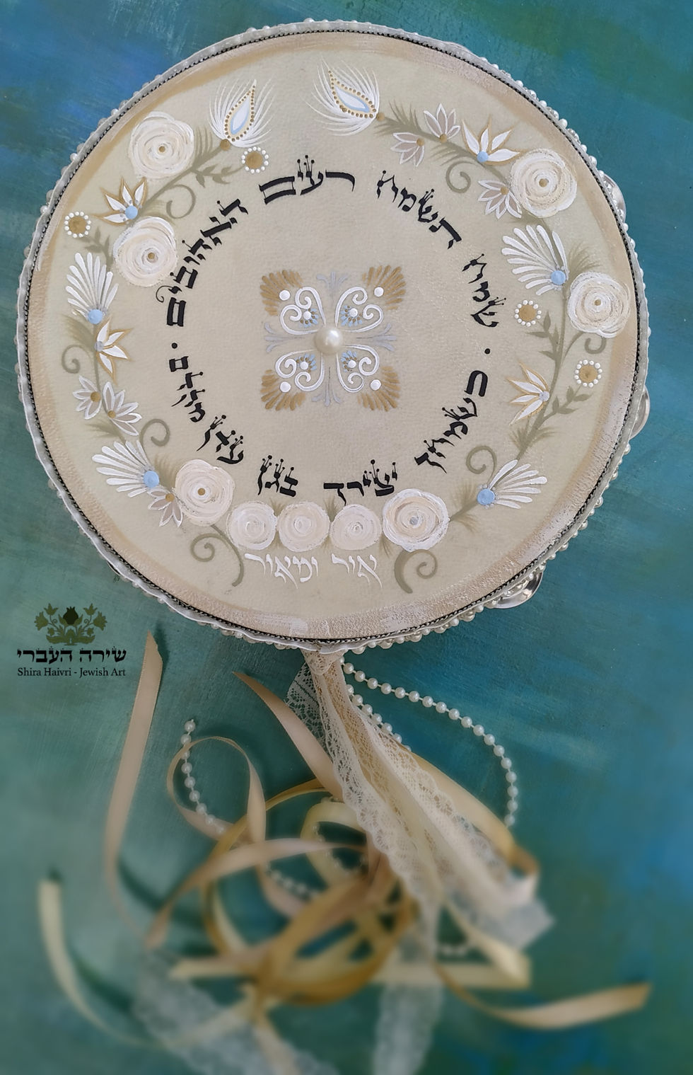 ברכת הכלה המעוצבת שלנו נמצאת בחלקו הפנימי של התף, ובצידו החיצוני דוגמאות יפהפיות לבחירתך